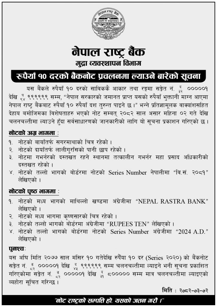 सोमबारबाट प्रचलनमा ल्याइएको १० रुपैयाँको नयाँ नोटमा सबैकुरा साबिककै हुने भएको छ । उक्त नोटमा दस्तखत भने तत्कालीन गर्भनर महाप्रसाद अधिकारीकै रहने नेपाल राष्ट्र बैंकले सूचना मार्फत जानकारी गराएको छ ।