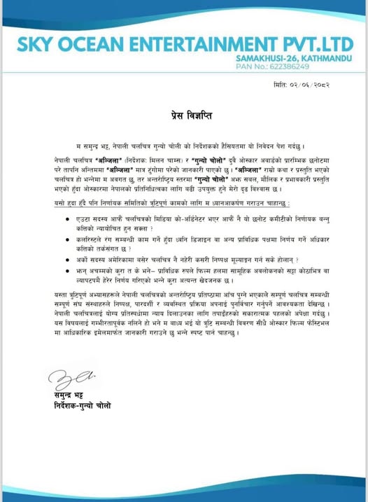 ललितपुर । अमेरिकामा अर्को वर्ष (सन् २०२६ मा) हुने ९८औं संस्करणको एकेडेमी अवार्ड (ओस्कार अवार्ड) मा गत वर्षको सुपरहिट फिल्म ‘अञ्जिला’ले नेपालको प्रतिनिधित्व गर्ने भए पछि अर्को चलचित्र ‘गुन्यो चोलो’की निर्देशक समुन्द्र भट्टले छनौट प्रकृया प्रति प्रश्न उठाएकी छन् ।