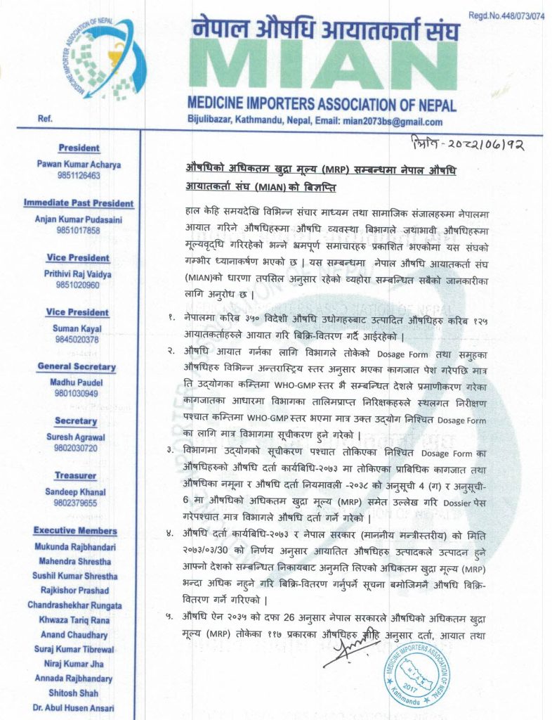सङ्घका तर्फबाट अध्यक्ष पवन कुमार आचार्यले जारी गरेको प्रेस विज्ञप्तिमा औषधिको अधिकतम खुद्रा मूल्य एमआरपी भन्दा अधिक नहुने गरी बिक्री वितरण गर्नुपर्ने सूचना बमोजिम नै औषधि बिक्री–वितरण गर्ने गरिएका उल्लेख छ ।