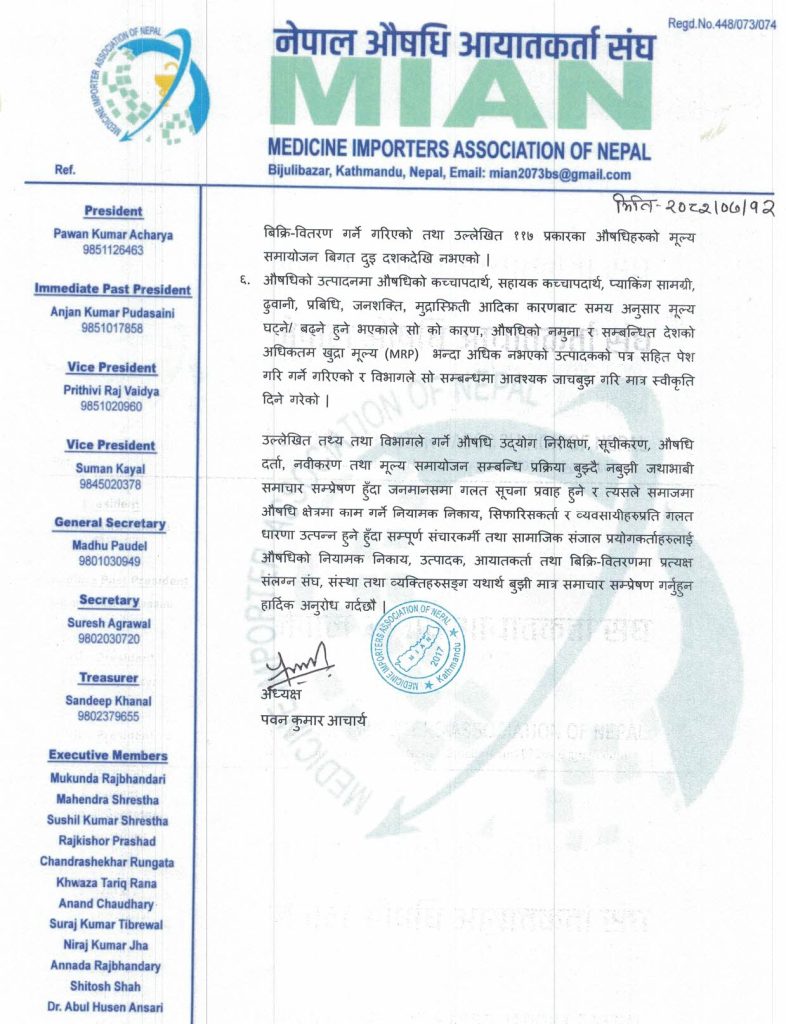 ललितपुर । नेपाल औषधि आयातकर्ता सङ्घले नेपालमा आयात गरिने औषधिहरूमा औषधि व्यवस्था विभागले जथाभाबी औषधिहरूमा मूल्यवृद्धि गरिरहेको भन्ने खबरहरूप्रति सङ्घको गम्भीर ध्यानाकर्षण भएको जनाएको छ ।