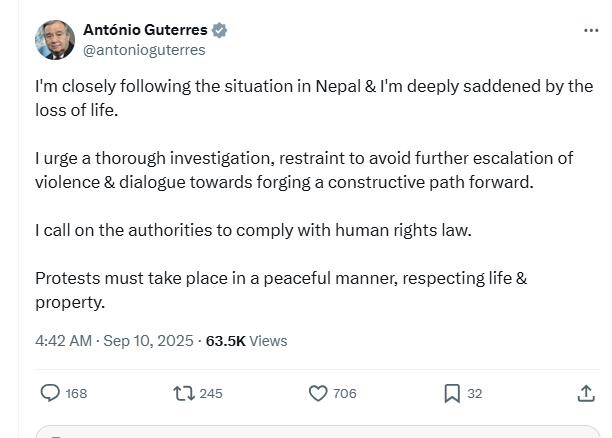 कानूनको पालना गर्न र संयम अपनाउन संयुक्त राष्ट्रसंघका महासचिव गुटेरसको सन्देश