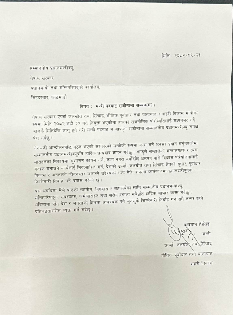 ललितपुर - ललितपुर । उर्जा, जलस्रोत, भौतिक पूर्वाधार तथा यातायात र सहरी विकासमन्त्री कुलमान घिसिङले राजीनामा दिएका छन् । उनले बुधबार राती प्रधानमन्त्री सुशीला कार्कीसमक्ष राजीनामा बुझाएका हुन् ।
