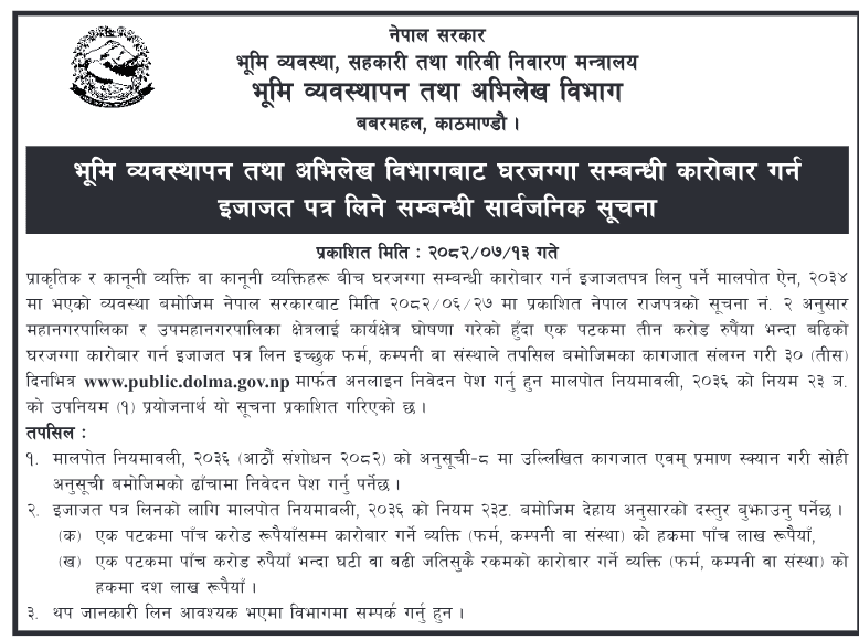 सरकारको उक्त व्यवस्था अनुसार भूमि व्यवस्था, सहकारी तथा गरिबी निवारण मन्त्रालयअन्तर्गतको भूमि व्यवस्थापन तथा अभिलेख विभागले आज सार्वजनिक सूचना जारी गर्दै घरजग्गा कारोबारको इजाजतपत्र (लाइसेन्स)का लागि दरखास्त आह्वान गरेको छ ।