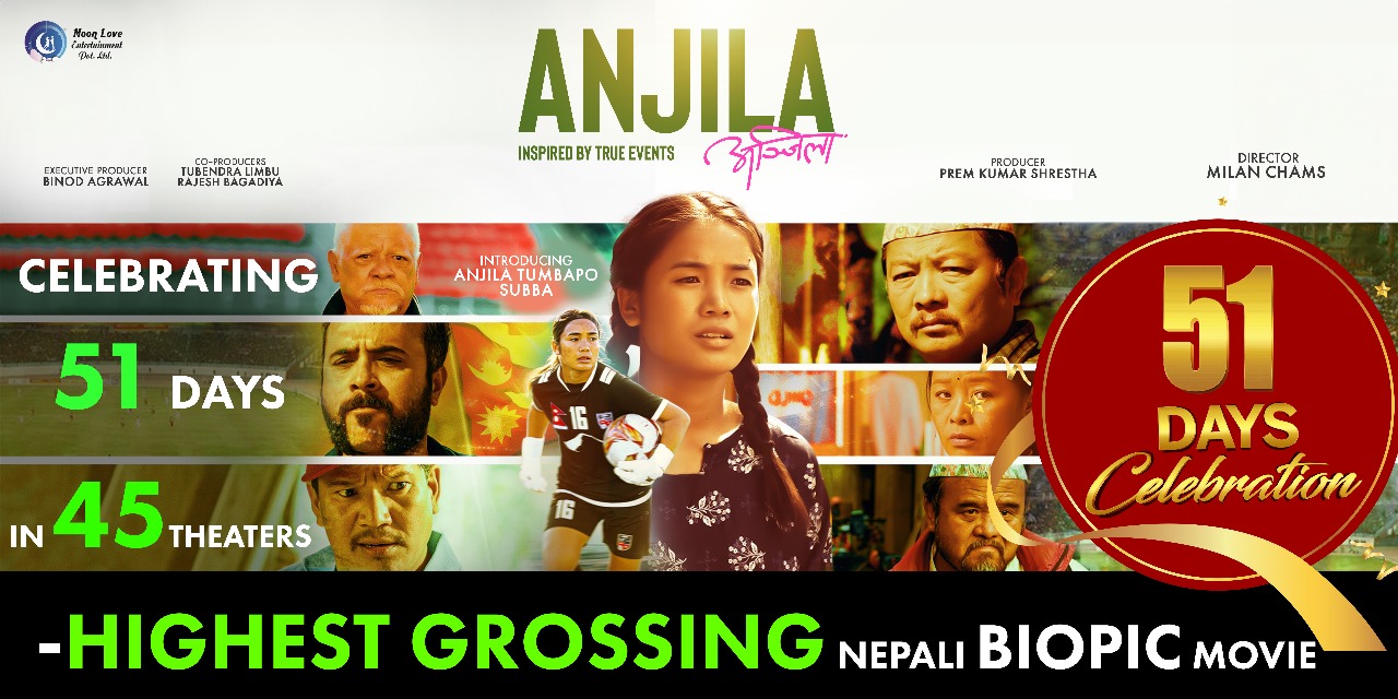 ललितपुर । राष्ट्रिय महिला फुटबल खेलाडी एन्जिला तुम्बापो सुब्बाको जीवन कथामा आधारित मिलन चाम्स निर्देशित २०८१ सालको सुपरहिट चलचित्र ‘अञ्जिला’ प्रदर्शनको १०० दिन नजिक पुग्दा मुख्य मल्टिप्लेक्स चेन क्यूएफएक्सले आज बिहीबार देखी १०० रुपैयाँ शुल्कमा देखाउन थालेको छ ।