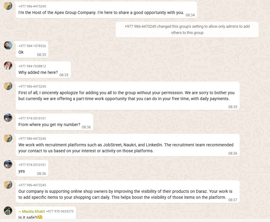 झ्याप्प दिमागमा अघिल्लो वर्ष पुस ९ गते रातोपाटीमा शङ्कर अर्यालले जब ‘स्क्यामर’ले नै खातामा धमाधम पैसा पठाए….. शीर्षकमा लेखेको स्क्याम स्टोरी आउँछ । त्यसपछि ती प्रोफाइलहरू दोहोराएर चेक गरेपछि म्यासेजहरू पढ्न थाल्छु । ग्रुपमा नाम भएको मोबाइल प्रयोगकर्ता मनिता , आरती ,देवीले प्रश्न गर्छन् ग्रुपका बारे । त्यसमा एपेक्स ग्रुप कम्पनीको रूपमा आफ्नो परिचय होस्टको रूपमा दिँदै एक मोबाइल प्रयोगकर्ताको जवाफ आउँछ यहाँहरू माझ खुसी साटन आएको छु । पार्ट टायम जबको रूपमा पैसा कमाउने अवसर लिएर आएका छौ । केही टास्क पुरा गर्नासाथ पैसा आउँछ । अनि केही टास्क दिइन्छ । ग्रुप मध्यकैबाट लौ मैले पैसा पाए भनेर १५० रुपैयाँ इ सेवा मार्फत प्राप्त गरेको भनेर स्क्रिन सट पनि हालिन्छ । बेला बेला यो अनधिकृत त हैन नि भनेर पनि सोधिन्छ । टास्क पुरा गरेर हाम्रो एडमिनलाई पठाइहाल पनि भनिन्छ ।