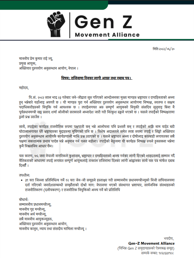 जेनजी मुभमेन्ट अलायन्सले अख्तियार प्रमुख राईसहित सम्पूर्ण आयुक्तहरूलाई तत्काल स्वेच्छिक राजीनामा दिन दियो दवाव
