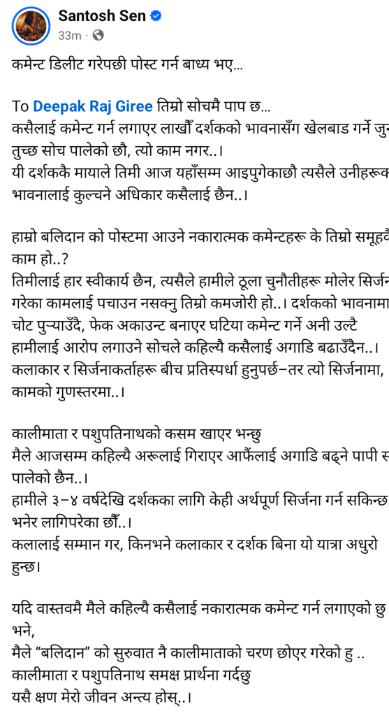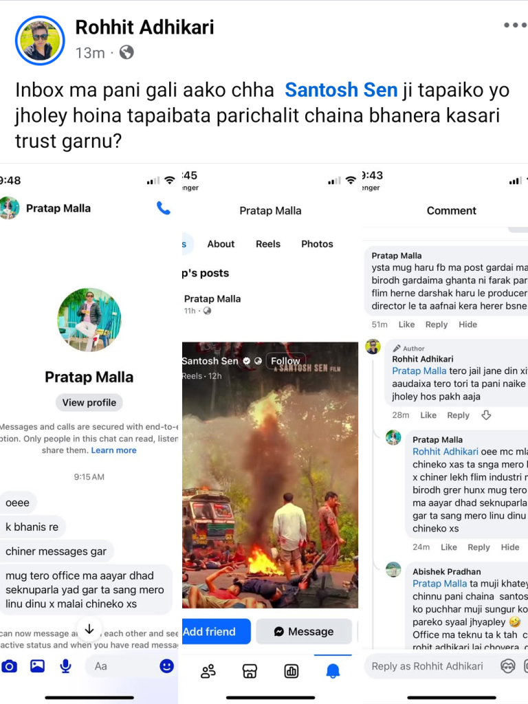 ललितपुर । कलाकार तथा निर्माता दीपकराज गिरी र अर्का निर्माता सन्तोष सेनबीच आज बिहानै देखि फेसबुक “वार” सुरु भएको छ ।