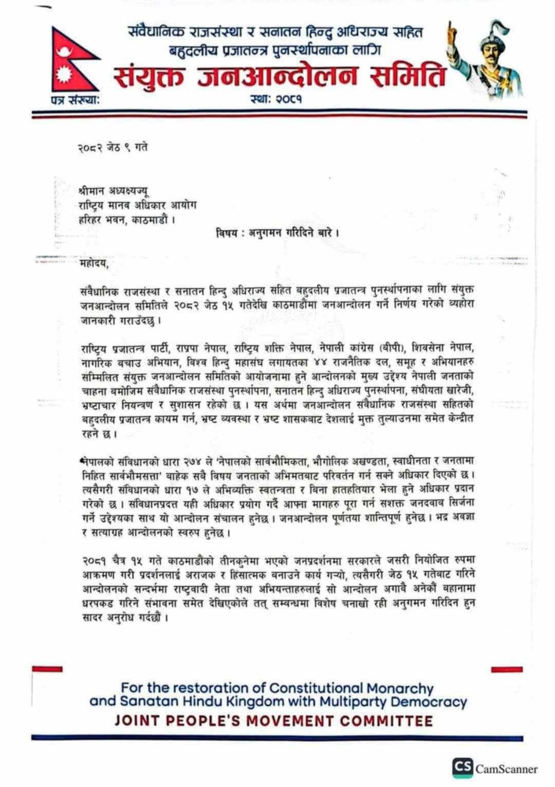 यता राजसंस्था पुर्नस्थापनाका लागि संयुक्त जनआन्दोलन समितिले जेठ १५ गते सुरु हुने जनआन्दोलनको स्वतन्त्र र सुक्ष्म ढंगले पर्यवेक्षण गर्न राष्ट्रिय मानवअधिकार आयोगको ध्यानाकर्षण गराएको छ ।