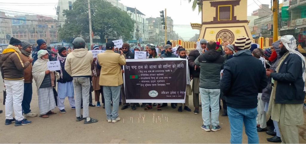 ललितपुर । बंगलादेशमा भएको हिन्दू युवाको निर्मम हत्याको विरुद्धमा मधेश प्रदेशको जनकपुरधाम र वीरगन्जमा प्रदर्शन भएको छ । महिला अभियानी जनकपुरधामको ब्यानर र नेतृ विभा ठाकुरको नेतृत्वमा शुक्रबार जनकपुरधाममा हिन्दू दिपु चन्द्र दासको हत्या विरुद्धमा प्रदर्शन गरिएको हो ।