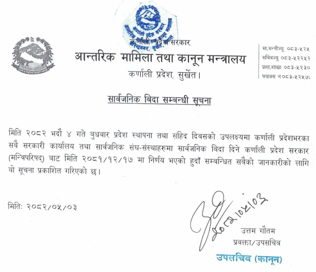 कर्णाली ‘प्रदेश स्थापना तथा सहिद दिवसको उपलक्ष्यमा कर्काली प्रदेशभरका सबै सरकारी कार्यालय तथा सार्वजनिक संघ(संस्थाहरूमा बुधबार विदा दिने निर्णय भएको हुँदा सम्बन्धित सबैको जानकारीको लागि यो सूचना प्रकाशित गरिएको छ’, मन्त्रालयद्वारा जारी सूचनामा भनिएको छ।