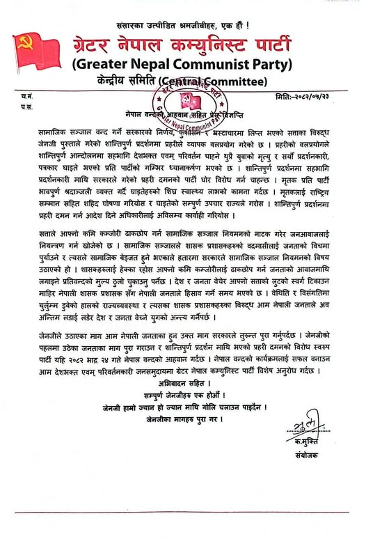 मंगलबार अर्थात् भदौ २४ गते पार्टीले नेपाल बन्दको घोषणा गरेको हो ।