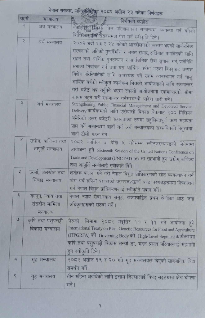 विहीबारको मन्त्रिपरिषदको बैठकले वैकल्पिक विकास वित्त परिचालनका सम्बन्धमा व्यवस्था गर्न बनेको अघि बढाउने, न्याय सेवाका ८ जना अधिकृतहरूको सरुवा गर्ने, असोज १९ र २० गते गृह मन्त्रालयले दिएको सार्वजनिक बिदाको समर्थन गर्ने, इलामलाई ३ महिना विपद् सङ्कटग्रस्त क्षेत्र घोषणा गर्नेलगायतका महत्वपूर्ण २० निर्णयहरु गरेको छ ।