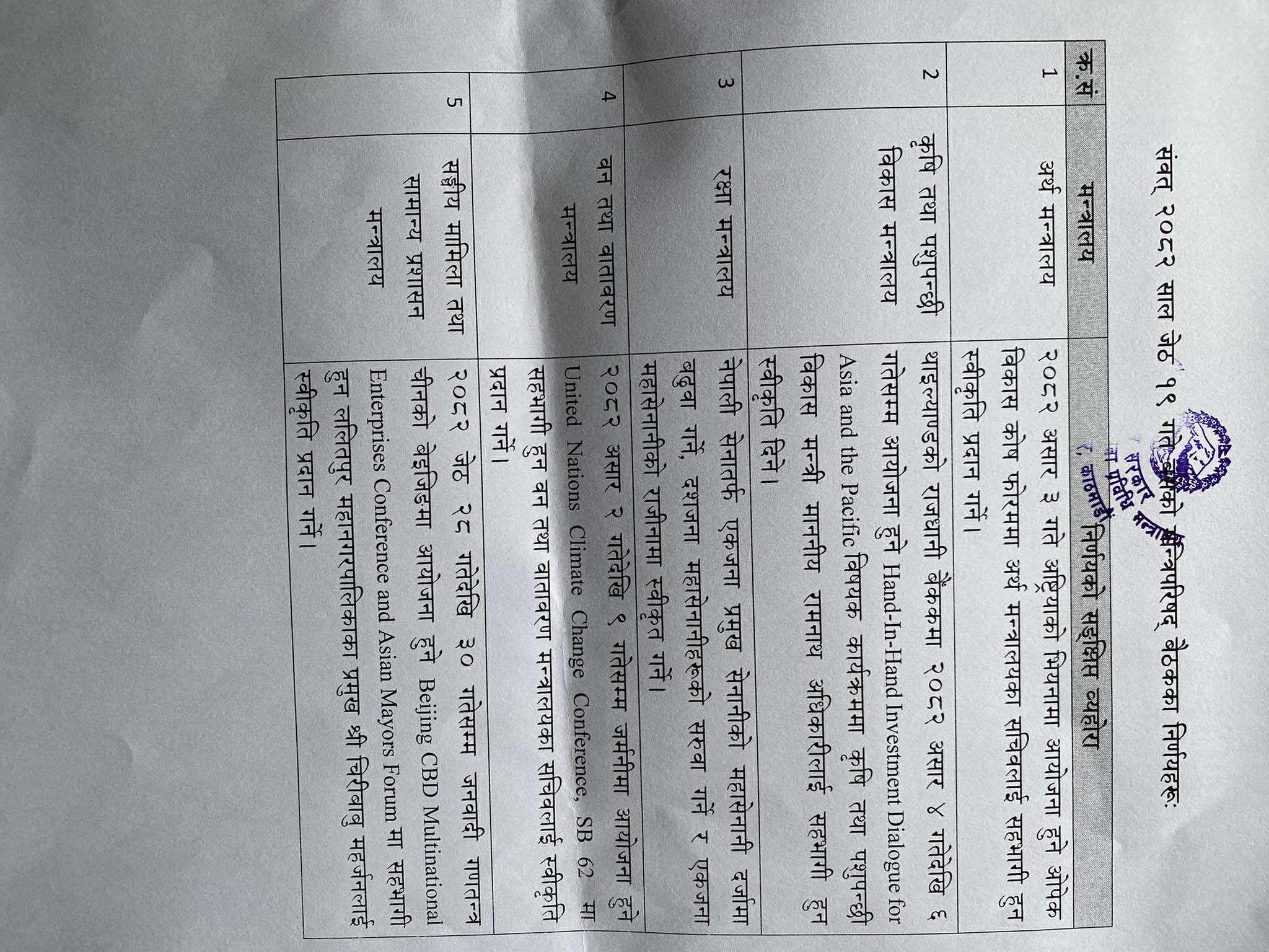 ललितपुर - ललितपुर । जेठ १५ र जेठ १९ गते बसेको मन्त्रिपरिषद्को बैठकले १४ वटा निर्णयहरु गरेको छ ।