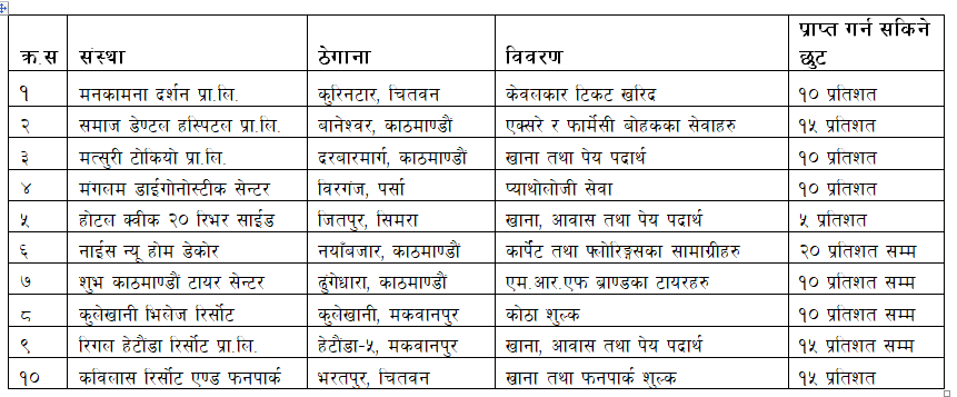सम्झौता पश्चात महालक्ष्मी विकास बैंकका डेबिट अथवा क्रेडिट कार्ड तथा मोबाइल बैंकिङ्ग प्रयोग गर्ने ग्राहकहरुले उक्त संस्थाहरुका विभिन्न सेवाहरुमा विशेष छुट प्राप्त गर्न सक्नेछन् । उक्त संस्थाहरु र प्राप्त गर्न सकिने छुट निम्न लिखित छन्ः