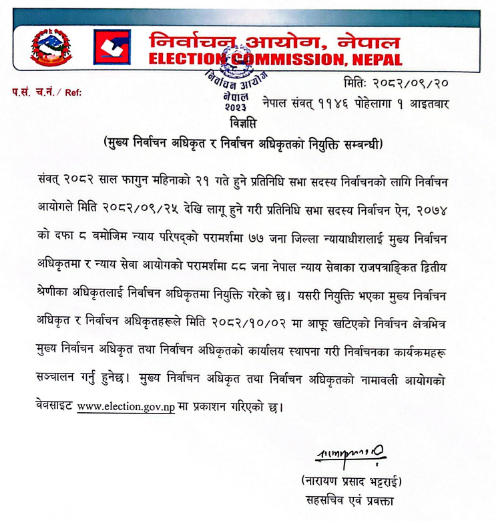 आयोगले आइतबार एक विज्ञप्ति जारी गर्दै आगामी फागुन २१ का लागि तोकिएको निर्वाचनका लागि निर्वाचन अधिकृत पनि नियुक्त गरिसकिएको जानकारी गराएको छ ।