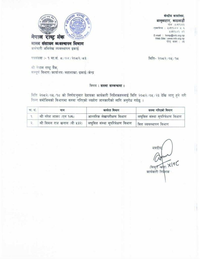 राष्ट्र बैंकले बुधबार एक सूचना जारी गर्दै कर्मचारीहरुलाई सरुवा गरिएको निर्णय सार्वजनिक गरेको छ । उक्त सूचनाअनुसार दुई कार्यकारी निर्देशक सरुवामा परेका छन्। आन्तरिक लेखापरीक्षण विभागमा कार्यरत नरेश शाक्यलाई लघुवित्त संस्था सुपरिवेक्षण विभागमा सरुवा गरिएको छ भने लघुवित्त सुपरिवेक्षणका विमलराज खनाललाई वित्त व्यवस्थापन विभागमा ल्याइएको छ ।