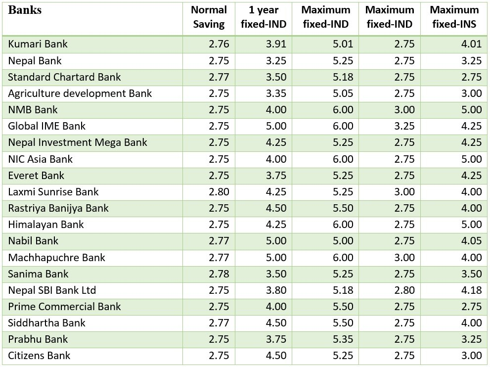 विवरण अनुसार २० वाणिज्य बैंकहरूमध्ये साधारण मुद्दती निक्षेपमा बैंकहरूले न्यूनतम २.७५ प्रतिशतदेखि अधिकतम २.८० प्रतिशतसम्म ब्याजदर तोकेका छन् । विभिन्न प्रकारका बचत खाताबिच २ प्रतिशत भन्दा धेरै ब्याजदर अन्तर हुन नपाउने व्यवस्था छ भने रेमिट्यान्स खाताको ब्याजदरमा थप १ प्रतिशत विन्दुले ब्याजदर थप्न पाउने व्यवस्था छ । बैंकहरूले त्यही रेञ्जभित्र रहेर विशेष खाता तथा रेमिट्यान्स खाताको ब्याजदर निर्धारण गरेका छन् ।