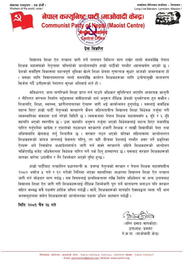 विज्ञप्तिमा भनिएको छ, विद्यालय शिक्षा ऐन तत्काल जारी गर्ने लगायत विभिन्न माग राखेर लामो समयदेखि नेपाल शिक्षक महासंघको नेतृत्वमा चलिरहेको आन्दोलनप्रति हाम्रो पार्टीको गम्भीर ध्यानाकर्षण भएको छ । देशको सर्वांङ्गिण विकासमा महत्वपूर्ण भूमिका खेल्ने शिक्षा क्षेत्रमा गुणात्मक सुधार आजको आवश्यकता हो । यसका लागि विद्यालयस्तरमा लामो समयदेखि कार्यरत शिक्षकहरूका लागि उत्प्रेणामुखी वातावरण सिर्जना गर्दै उनीहरूको पेशागत सुरक्षा अनिवार्य शर्त हो ।