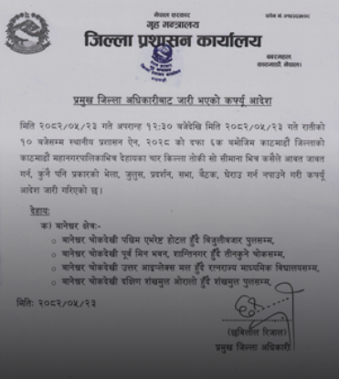 जिल्ला प्रशासन कार्यालयले जारी गरेको सूचना अनुसार नयाँ बानेश्वर चोकदेखि पश्चिम एभरेस्ट होटल हुँदै बिजुली बजारसम्म, बानेश्वर चोकदेखि पूर्वतर्फ मिन भवन, शान्तिनगर हुँदै तीनकुने चोकसम्म, बानेश्वरदेखि उत्तर आइप्लेक्स मल हुँदै रत्नराज्य माध्यमिक विद्यालयसम्म र बानेश्वर चोकदेखि दक्षिण शंखमुल ओरालो हुँदै शंखमुल पुलसम्म कर्फ्यु आदेश जारी गरिएको उल्लेख छ ।