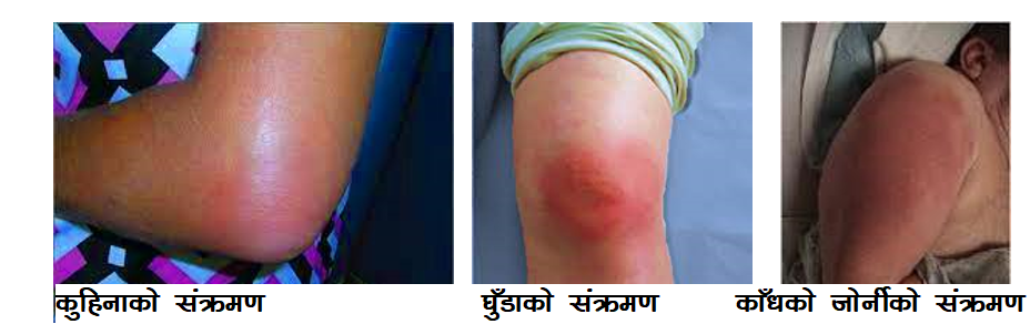 सङ्क्रमित जोर्नी एक्कासि सुन्निने, जोर्नी वरिपरि रातो हुने, तातो हुने, दुख्ने, जोर्नी चलमल गर्दा झन् बढी दुख्ने