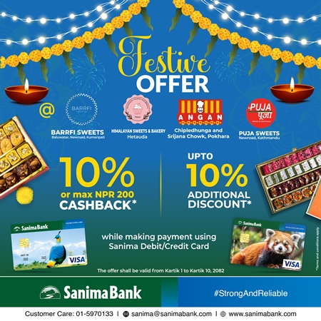 योजना अवधिभर ग्राहकहरुले साझेदार मर्चेन्टहरुबाट मिठाई खरिद गरी सानिमा बैंकको डेबिट तथा क्रेडिट कार्डबाट भुक्तानी गर्दा १०% वा अधिकतम् रु. २००/– सम्मको क्यासब्याक र थप १०% सम्मको छुट प्राप्त गर्न सक्नेछन् ।
