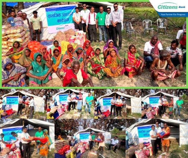 सिटिजन्स बैंक इन्टरनेसनल लिमिटेडले आफ्नो संस्थागत सामाजिक उतरदायित्व कार्यक्रम अन्तर्गत सप्तरी राजविराज स्थित महादेवा गाउँपालिकाको चिमटी टोलका ४६ घर धुरी अग्नि पिडितहरुलाई राहत स्वरुप खाद्यान्न सामाग्री लगायत लत्ता कपडाहरू वितरण गरेको छ । गत वैशाख १८ गते भएको आगलागी बाट ती परिवारका घर तथा चौपायाहरु जलेर नष्ट भएका थिए । घर जलेर घरबारविहीन भएका परिवारहरुलाई सानै भएता पनि सहयोग गर्न पाँउदा पिडितहरुको दिनचर्यामा केही दिनको लागी भए पनि सहजता आउने विश्वास बैंकले लिएको छ ।