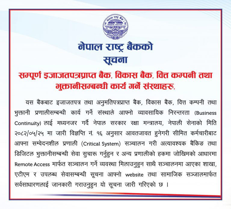 विहीबार एक सूचना जारी गर्दै केन्द्रीय बैंकले सम्पूर्ण इजाजत प्राप्त बैंक, विकास बैंक, वित्त कम्पनी तथा भुक्तानी सम्बन्धी कार्य गर्ने सस्थाहरुलाई जोखिमको आधारमा रिमोट एक्सेसमार्फत सेवा सञ्चालन गर्ने व्यवस्था मिलाउन भनेको छ । केन्द्रीय बैंकले सञ्चालनमा आएका शाखा, एटीएम र उपलब्ध सेवासम्बन्धी जानकारी आफ्ना वेवसाइट र सामाजिक सञ्जालमार्फत सर्वसाधारणलाई जानकारी गराउन भनेको छ ।