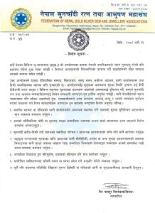 महासङ्घले बजारमा आउन सक्ने सम्भावित अवैध गरगहनाको रोकथाम र व्यवसाय सुरक्षित राख्न सबै सदस्य तथा व्यवसायीलाई उच्च सतर्कताका साथ कारोबार गर्न अपिल गरेको छ।