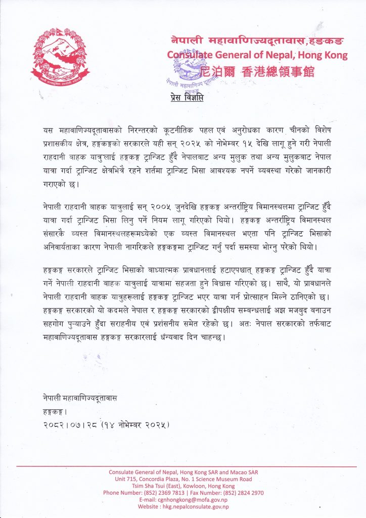 ललितपुर । नेपाली महावाणिज्यदुतावासको निरन्तर अनुरोधका कारण चीनको विशेष प्रशासकीय क्षेत्र, हङकङको सरकारले भोलिदेखि ट्रान्जिट भिसाको प्रावधान हटाउने निर्णय गरेको छ । १५ नोभेम्बर अर्थात कात्तिक २९ गतेदेखि नेपाली राहदानी भएका यात्रुलाई ट्रान्जिट भिसा अनिवार्य नियम हटाएको छ। यसले नेपाली यात्रुको हङकङ विमानस्थलबाट यात्रा सहज हुने देखिन्छ ।