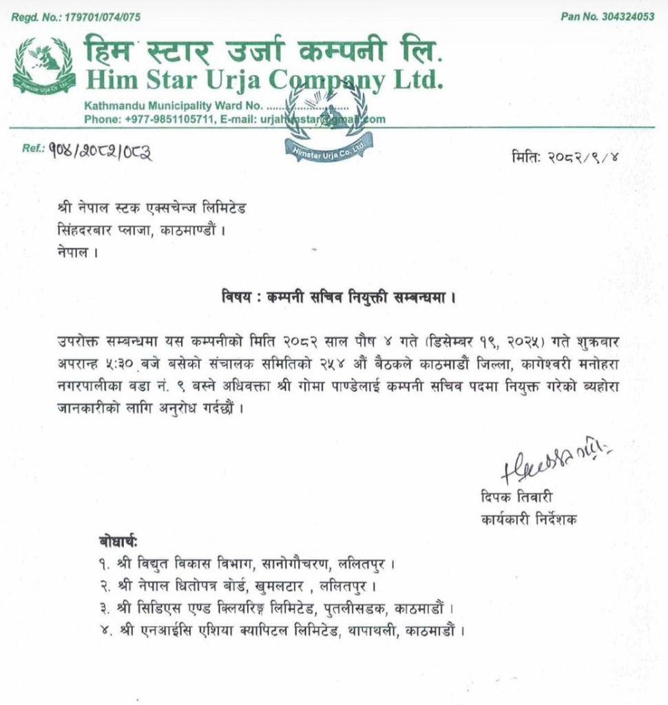 ललितपुर । हिम स्टार उर्जा कम्पनी लिमिटेडको कम्पनी सचिवमा अधिवक्ता गोमा पाण्डे नियुक्त भएकी छन् ।