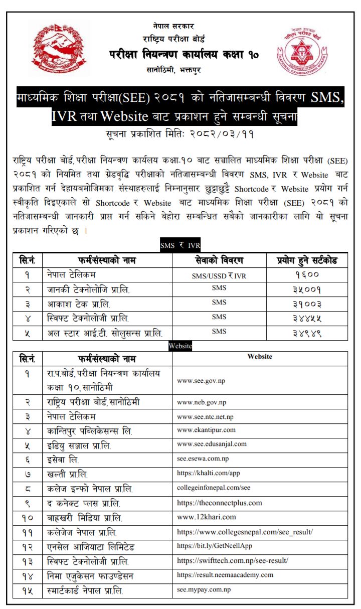 एसईई–२०८१ को नतिजासम्बन्धी विवरण  SMS, IVR,, तथा WEBSITE बाट प्रकाशन हुने बोर्डले जनाएको छ ।