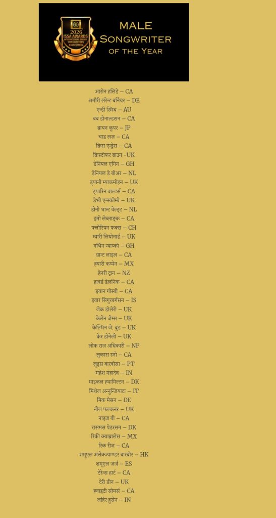 आयोजकले सार्बजनिक गरेको बर्षको अन्तर्राष्ट्रिय गीतकार पुरुष बिधामा नेपाली प्रसिद्ध गीतकार लोकराज अधिकारी सहित मनोनयनमा परेका ४६ जनामा आरोन हलिडे CA,अमौरी लरेन्ट बर्नियर DE,एन्डी स्मिथ – AU,बब डोनाल्डसन CAब्रायन कूपर – JP,चाड लज CA,क्रिस एन्ड्रेस – CA,क्रिस्टोफर ब्राउन – UK,डेनियल एगिन – GH,डेनियल डे बोअर – NL,ड्यानी म्याकमोहन – UK,ड्यारिन वाल्टर्स – CA,डेभी एन्स्कोम्बे – UK,डोनी भान्ट वेल्ट – NL,इमो लेब्लाङ्क – CA,फ्लोरियन फक्स CH,ग्यारी लियोनार्ड UK,गर्भिन न्याप्को – GH,ग्रान्ट लाइल CA,ह्यारी कप्पेन MX हेनरी ट्रान – NZ,हावर्ड डेलनिक – CA इयान गोस्बी – CA,इवार सिगुरवर्गसन – IS जेक डोलेरी – UK,केलेन जेम्स – UK,केल्भिन जे. वुड – UK,केर डोनेली – UK,लुकास स्नो – CA,लुइस बारबोसा – PT ,महेश महादेव – IN,माइकल ह्यामिल्टन – DK,मिशेल अन्नुन्जियाटा – IT,मिक मेसन – DE,नील फल्कनर UK,नाइज बी- CA,रासमस पेडरसन DK,रिकी क्याब्रालेस – MX,रिक रीज – CA,शमूएल अलेक्ज्याण्डर बारबोर – HK,शमूएल जर्ज – ES,टेरेन्स हार्ट – CA,टेरी डीन – UK,स्वाइटी सोमर्स – CA रजहिर हुसेन – IN मनोनयनमा परेका छन । उनिहरु मध्य ट्प २० हुँदै अन्तिम बिजेता छनौट गरिने छ ।