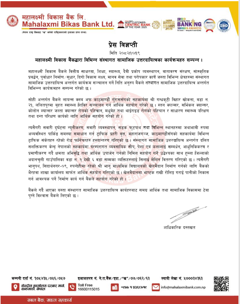 ललितपुर – महालक्ष्मी विकास बैंकले आफ्नो संस्थागत सामाजिक उत्तरदायित्व (CSR) नीतिअनुसार वित्तीय साक्षरता, शिक्षा, स्वास्थ्य, दैवी प्रकोप व्यवस्थापन, वातावरण संरक्षण, सांस्कृतिक प्रवर्द्धन, पूर्वाधार सुधार, दिगो विकास लक्ष्य, मानव सेवा तथा परोपकार कार्य जस्ता विभिन्न क्षेत्रहरूमा सक्रिय कार्यक्रमहरू सञ्चालन गर्दै आएको छ ।