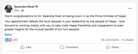 मोदीले बालेनसँग मिलेर नेपाल–भारत सम्बन्ध अझै उचाइमा पुर्याउन उत्सुक रहेको पनि बताएका छन् । ‘भारत–नेपालबीचको मित्रता र सहकार्यलाई दुवै देशका जनताको पारस्परिक हितका लागि अझ उचाइमा पुर्याउन तपाईंसँग नजिकबाट काम गर्न म उत्सुक छु,’ मोदीले लेखेका छन् ।