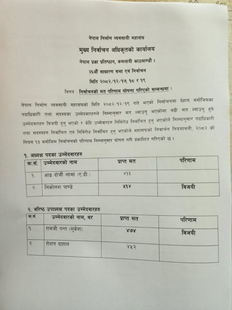 नेपाल निर्माण व्यवसायी महासंघको अध्यक्षमा निकोलस पाण्डे ५१४ मतसहित निर्वाचित भएका छन् । उनले प्रतिस्पर्धी आङदोर्जी लामालाई पराजित गरेका, जसले ४१३ मत प्राप्त गरेका थिए ।