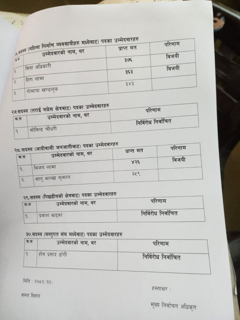 अध्यक्षमा निर्वाचित पाण्डे कालिका कन्स्ट्रक्सनका सञ्चालक तथा एएसी ब्रिक उत्पादक संघका अध्यक्षसमेत हुन् । वरिष्ठ उपाध्यक्षमा रामजी पन्त ४७४ मतसहित विजयी भएका छन् ।