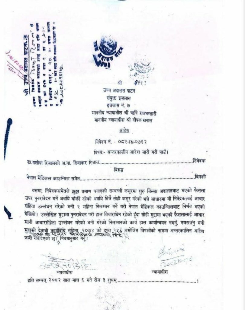ललितपुर – चिकित्सकलाई कारबाही गर्ने नेपाल मेडिकल काउन्सिलको निर्णयमा उच्च अदालत पाटनले रोक लगाएको छ । उपचारसम्बन्धी गलत कागजात बनाएको अभियोगमा दोषी ठहर भएकी डा। यशोदा रिजाललाई दुई महिनाका लागि निलम्बन गर्ने काउन्सिलको निर्णय तत्काल कार्यान्वयन नगर्न अदालतले अन्तरकालीन आदेश दिएको हो ।